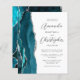 The left-hand edge of this elegant modern wedding invitation features a teal watercolor agate border trimmed with faux silver glitter. The customizable text combines charcoal grey script and sans serif fonts on a white background. The reverse side features a matching teal and silver agate design.