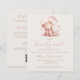 This cute baby shower invitation features a sweet watercolor teddy bear in a pink dress surrounded by gold stars, above the words "we can bearly wait" in pink handwriting script. Personalize the text with the name of the mom-to-be in pink script and the details in sans serif font on a beige background. The reverse side provides space for diaper raffle, books for baby, and registry details, along with a convenient QR code guests can scan to visit the registry. Ideal for a girl's baby shower.
