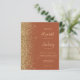 The left-hand edge of this elegant modern wedding invitation features a gold faux glitter border. The customizable text combines pale gold-coloured handwriting, copperplate and italic fonts on a terracotta background. The reverse side features a matching terracotta and gold glitter design.