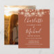 Featuring pretty string lights and signature style names. This elegant budget terracotta wedding invitation can be personalized with your wedding details in chic lettering and special photo on the reverse. Designed by Thisisnotme©