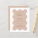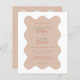 This beautiful wedding invitation is framed by a delicate wave scallop border. It features a tranquil palette with soothing shades of terracotta complemented by soft greens and earthy tones. The playful yet sophisticated fonts dance across the page, blending whimsy with elegance, and selected words highlighted in deep sage green add a delightful pop of colour. More than just an invitation, it's a prelude to a celebration filled with charm and joy, perfectly suited for couples seeking a mix of fun and sophistication in a design that softly speaks of nature and love.