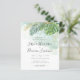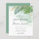 A trendy elegant tropical style wedding invitation featuring green and gold watercolor palm and monstera leaves with modern calligraphy.