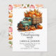 A Cute Thanksgiving Illustration with a truck full of pumpkins, corn and wheat on front and colourful pinkish orange pumpkins on the back. You can personalize this Invitation with your dinner details.