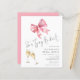Budget She’s Tying The Knot Pink Bow Bridal Shower. A smaller 4.5 x 5.6” budget priced alternative on a semi gloss 110lbs similar in thickness to a postcard. There is ONE per sheet. The main header is in an elegant set script. The rest of the text you can easily personalise.
