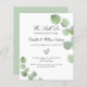 A white background decorated with eucalyptus greenery, sprigs. Personalize and your name and ceremony details.