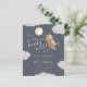 We can bearly wait! Cute teddy bear theme budget baby shower invitation featuring a watercolor illustration of a bear cub holding a balloon with some clouds and stars around it. Handwritten script and elegant typography complement the design placed against an off-navy blue background. This invitation is great for a gender-neutral shower in the fall.