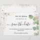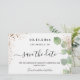 A trendy wedding Save the Date. A stylish white background decorated with eucalyptus foliage and faux gold glitter dust. Personalize and add a date, names and text. . The text: Save the Date is written with a large trendy hand lettered style script with swashes.