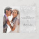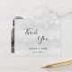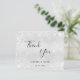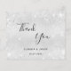 A wedding thank you card. A faux silver metallic looking background colour. With faux glitter dust. On front, a large hand lettered script and the text: Thank You, your names and a date.