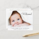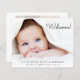 Simple budget-friendly photo birth announcement. Your newborn's photo fills the front and is overlayed with "Welcome!" in a contemporary script (you can move this text to another area on the card to suit your photo by selecting "edit in the design tool"). Add his or her name, arrival date and birth stats. On the reverse side, add four additional family photos, a "welcomed by" message and the parent's and sibling's names.