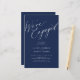 Simple minimal chic whimsical calligraphy dark navy blue we're engaged script budget affordable engagement party invitation.