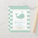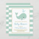 This sweet gender-neutral drive-by baby shower invitation features a cute mint green whale spouting blue water drops. The words "Baby Shower" and the customizable name of the mom-to-be appear in matching blue handwriting font. Beyond the faux gold rectangular frame is a background of mint green and white stripes.