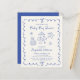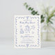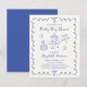 Budget-friendly light cream baby boy shower invitation featuring a french blue wavy frame adorned with bows, whimsical blue hand drawn illustrations of hearts, stars, cake and nursery decor. "Baby Boy Shower" and the name of the mother-to-be are showcased in a fun, playful blue script. A larger card stock version is available (see the collection or message us for the link).