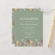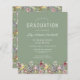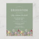 A beautiful watercolor floral border of wildflowers decorates the bottom edge of this trendy boho graduation party invitation. Customize the white text on a sage green background with the graduate's name in handwriting script; the school and class year in sans serif; and the date, venue, and RSVP details in serif font. The back of the card features a coordinating pattern of wildflowers on a sage green background.