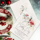 Red and white winter watercolor flowers are nestled in soft sage green leaves and foliage. Gold snowflakes add a festive touch. An elegant, simple and modern script gives it a open and airy vibe. There is also a winter floral boquet with a touch of golden snowflakes on the back.