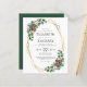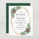 This design features a gold geometric frame decorated with watercolor pine cones and winter greenery, including eucalyptus and holly leaves. Ideal for a winter or Christmas themed wedding. The back of the card is a matching shade of solid green.