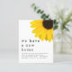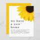 Yellow Sunflower Moving New Home Details. A budget friendly SMALLER 4.5” x 5.6” alternative to advise your new address. Available in a SEMI GLOSS 110 lb CARD STOCK or a SATIN FINISH 80 lb THINNER PAPER STOCK. Envelopes are an optional extra. The header is large in stylish lowercase with the details beneath. A partial large yellow sunflower decorates the top right corner. Easily personalise the text to your own details.
