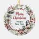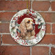 On the front of this Holiday ornament is the image of a beautiful buff American Cocker Spaniel Dog. The portrait is on a Christmas red background, and framed within a rustic twig, red berry, white floral and green leaf wreath. On the back, red and green text says MERRY CHRISTMAS" and "HAPPY NEW YEAR". The text is in customizable text fields, so you may make it say whatever you'd like.