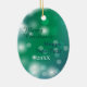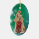 On the front of this Holiday ornament is an image of a buff colored English Cocker Spaniel dog wearing a red and white winter scarf. The image is stands out against a gradient green and blue bokeh background. The back of the ornament has the same background with custom white text that currently says "Merry Christmas Happy New Year" and the date. Cute for anyone, especially if you are "owned" by a Cocker Spaniel.
