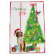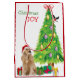 On each side of this Holiday gift bag, a buff Cocker Spaniel dog wears a Santa hat while he sits beside a Holiday tree. Around the dog brightly wrapped gift packages are scattered about. A bullfinch is landing on the Christmas tree. The red and green text says "Christmas JOY".