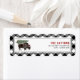 Illustration of a buffalo wearing a santa hat with a snow covered Christmas tree tied to its back. Border is black and white buffalo plaid pattern.