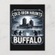 Framed by frostbitten gears, broken gauges, and icicle-draped bolts, the design exudes icy decay. The phrase “COLD IRON HAUNTS” crowns the top in cracked, frost-crusted lettering glowing faintly with ghost-light. Below, “BUFFALO” appears in bold distressed caps — worn like old metal left to corrode in a blizzard.