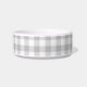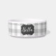 Grey Buffalo Plaid Personalized Pet Name on a small ceramic food or water cat or dog bowl with your new puppy dog or kitty cat's name in a calligraphy script font inside a faux light black chalkboard look fancy shape label. The farmhouse chic style in neutral colours will look great in a rustic or modern kitchen.