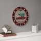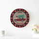 The border on this festive Holiday clock is a red and black buffalo plaid pattern. The interior of has a tan circle banner with a matching red and black plaid car carrying a green freshly cut Christmas tree. The black and red text above and below the image currently says "Merry Christmas", but you may easily change it, or remove it, if you'd like. White numbers make the clock easy to read. A cute addition to your holiday decor, and useful, too!