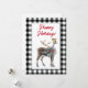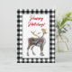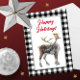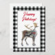 Carte de vacances tendance avec bordure en plaid de buffle noir et blanc avec illustration d'aquarelle d'orignal festif et texte "Joyeux jours fériés" personnalisable en rouge