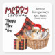 This Holiday sticker features a Corgi puppy wearing a red and white Santa hat. The dog sits in a woven wicker basket. Behind the pup is a red and black buffalo plaid pillow, and a matching gift package sits beside the basket. Buffalo plaid typography pairs with black script to say "MERRY Christmas", with "Happy New Year" below that. Your custom signature is in two easy to change text fields. Perfect for your Holiday correspondence.
