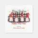 These Holiday paper napkins feature four little white bearded gnomes bringing seasonal greetings. Each of the gnomes is dressed in a different red and white pattern on their tall Santa hats. The images are placed on a black and white buffalo plaid swatch background. Scattered snowflakes drift down around them. The script text "Merry Christmas" is in white above them, and "Happy New Year" is below. Your custom text is in black and red at the bottom.