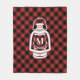 A fleece blanket featuring a red and black heritage (buffalo) plaid pattern. Centre features an illustration of a white camping lantern. Personalize the initial on lantern.