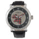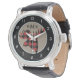 Here's a fun and trendy watch that is attractive, too! At the centre is a red and black buffalo plaid silhouette moose head. Above the moose image is your three letter monogram in black. The image is placed on a light tan background, which is surrounded by a black circle with white numbers, making the watch easy to read.