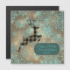 A brown buffalo plaid reindeer jumping in a sea of blue teal snowflakes on a brown backdrop creating whimsical fantasy christmas cheer including a blue teal banner where you can personalize your card.