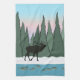 Super cool stylized winter scene featuring an elk in silhouette, fish swimming in the river, evergreen forest and a beautiful early morning or late afternoon sky. By Melissa J Barrett