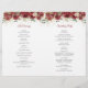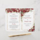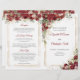 Elegant design for wedding folded program features watercolor deep red marsala roses and blush pink roses peonies mixed green fresh eucalyptus and woven into faux gold frame. Modern hand drawing script lettering.