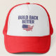 Build Back Better text and American Flag on US map image printed on red trucker hat.