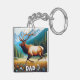 Un majestueux wapiti de taureau traverse une prairie avec des montagnes et des pins en arrière - plan, DAD au premier plan. Parfait pour papa anniversaire ou Fête des pères