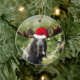 A bull moose with a nice rack and sticking out his tongue looks festive in a red Santa hat.