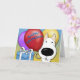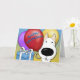 Adorable Big Nose Bull Terrier with a birthday present and holding balloons in his mouth. Balloon reads Rappy Rirthday!