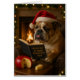 Humorous Christmas card featuring a Bulldog reading 'The Cheese Tax at Home Regulations 2025' whilst trying to resist the urge to eat the cheese that someone's left on the table right in front of its nose!