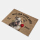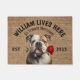 Bulldog Personalized Dog lover welcome doormat. This welcome mat can be personalized with your dog’s name, the slogan can also be changed or you could use a picture of your own dog (make sure it's transparent). Text reads: William lives here…. All treats welcome