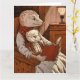 The image shows a warm scene of two ferrets, one adult and one young, sitting in a wooden armchair. The adult ferret, wearing a red and white scarf, holds a large book with a red binding, while the youngest, wearing glasses, is comfortably seated on his lap. The room is dimly lit by a lamp placed on a side table, throwing a warm glow on the stage.