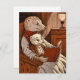 The image shows a warm scene of two ferrets, one adult and one young, sitting in a wooden armchair. The adult ferret, wearing a red and white scarf, holds a large book with a red binding, while the youngest, wearing glasses, is comfortably seated on his lap. The room is dimly lit by a lamp placed on a side table, throwing a warm glow on the stage.