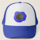 A blue and white hat featuring a photo of a young African Bullfrog sitting in a digitally created blue lake. This design is also available on all other colours of hat.