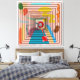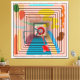 A vibrant and colourful geometric pattern featuring centred concentric squares draws the eye inwards, surrounded by various abstract shapes in bright hues. A targeted arrow points towards the focal point, adding a sense of direction and movement.