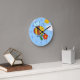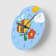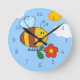Cute wall clocks for kids, pediatrician offices, baby nurseries, that feature a cartoon design of a bumble been with a red flower flying with a blue sky, clouds, and sun in the background.
