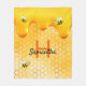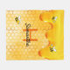 A golden bee honeycomb pattern and happy smiling bumble bees. Decorated with sweet dripping honey. Add your name and monogram letter, orange and black letters. The name is written with a hand lettered style script.