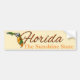 Though occasionally referred to as "The Peninsula State", Florida's official nickname is "The Sunshine State". It was adopted officially by the Florida legislature in 1970. It probably comes as no great surprise that the state flower of Florida is the Orange Blossom. Florida and oranges are almost synonymous, thanks to the abundant orange groves that produce so successfully in the tropical and subtropical climate for which the state is so famous. However, the name "Florida" is Spanish for "land of flowers" . . . again, courtesy of that fabulous Florida climate. Florida also has the distinction of being the only state to be bordered by both the Gulf of Mexico and the Atlantic Ocean. Florida became a state on March 3, 1845 and is our 27th state. While it is the 22nd most extensive, it is also the 3rd most populous. There are those that think the Florida state "bird" should be the "snowbird" . . . because of the vast number of Americans that reside in the north during summer, but winter in milder Florida. In spite of the obvious benefits of the location and climate, there are also downfalls . . . specifically, hurricanes -- the most recent of which (at this time) was the Category 4 storm in 2016, called "Matthew". In recent history, there was also the Category 5 disaster, Hurricane Andrew, 1992. But, in spite of the seasonal dangers, it's always "fun and sun" that attracts people to this magnificent state. It is said that every point in Florida is less than 60 miles from a beach. Whether it's a family vacation at Disney World or spring break in Fort Lauderdale, sunny, beautiful, amazing Florida is a state every American should visit at least once. This delightful design pays homage to our majestic 27th state, an outline of the state filled with iconic orange blossoms and oranges. This is layered with the deep orange "Florida" and anchored with a sunnier hue "The Sunshine State". This lovely bumper sticker is appropriate for sale in Florida souvenir shops and also a wonderful reminder of your memorable Florida vacation.