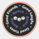Bunco Good Friends, Good Times and Good Laughs graphic design by Artinspired. Black, purple and orange theme perfect for October Halloween themes. Put a sticker on an invite, send a postcard reminder of invitation.