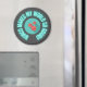 Those that love the game of Bunco will love this retro inspired design with red dice on a turquoise centre, neon aqua "Bunco makes my world go round" text on dark chalkboard grey background.
